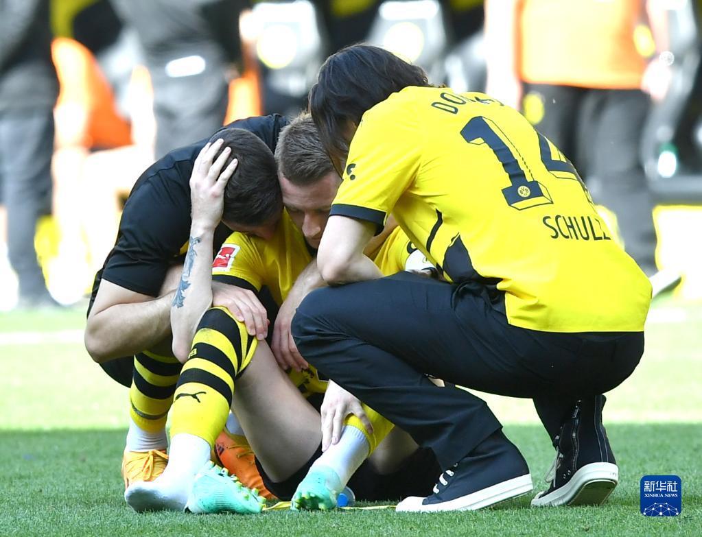 5月27日,多特蒙德队球员罗伊斯(中)在比赛后接受队友安慰。新华社记者 任鹏飞 摄