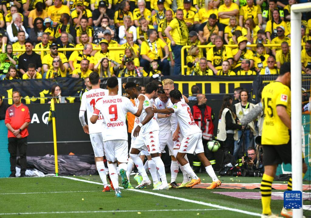 5月27日,美因茨队球员在比赛中庆祝进球。新华社记者 任鹏飞 摄