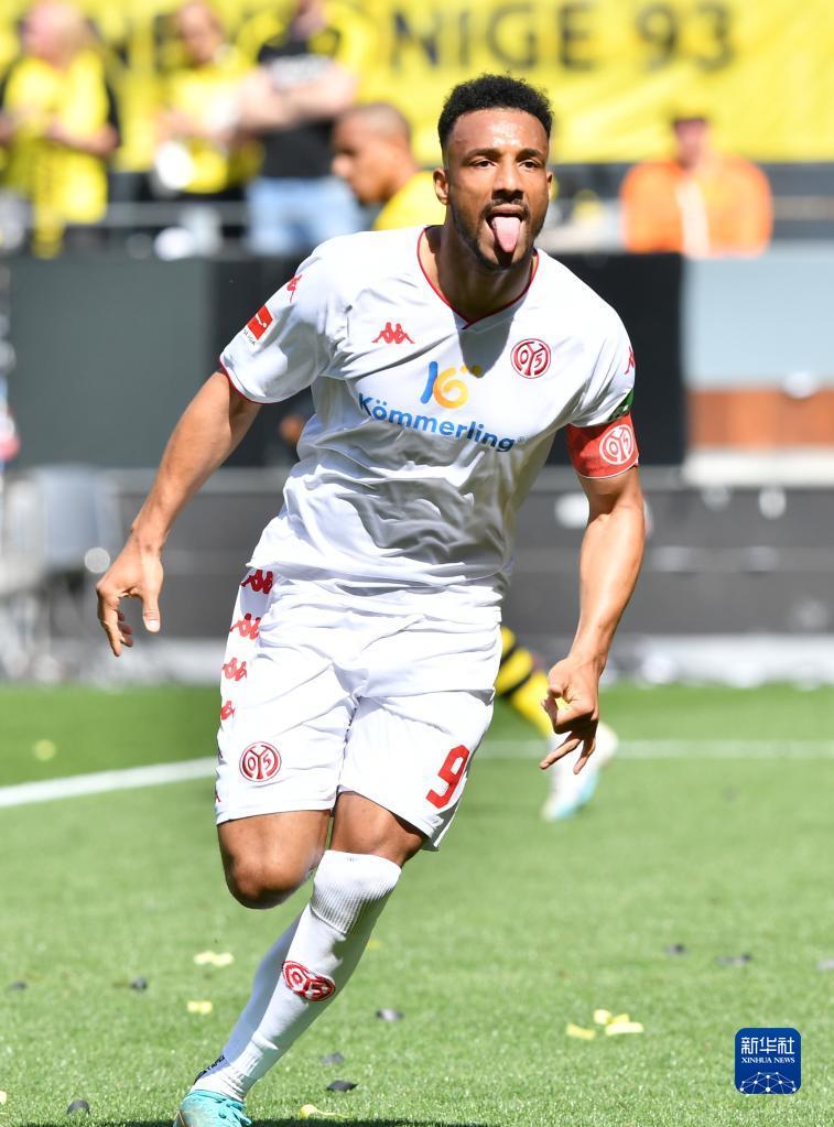 5月27日,美因茨队球员奥尼西沃在比赛中庆祝进球。新华社记者 任鹏飞 摄
