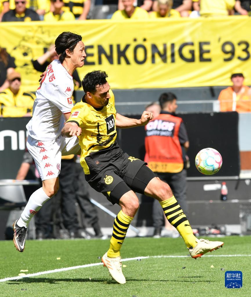 5月27日,多特蒙德队球员胡梅尔斯(右)在比赛中与美因茨队球员李在城拼抢。新华社记者 任鹏飞 摄