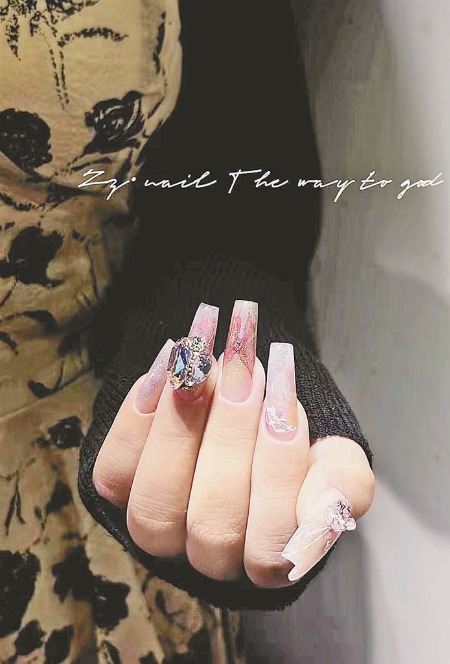 相比于其他人做的美甲,于子智追求的是更加精致风格的美甲。“我在做甲片时,不单单采用全贴和半贴,因为每个人的指甲大小、宽度都不一样,那种方式没有办法改善甲型。”于子智介绍,“我这种风格的美甲会对顾客的指甲先进行建构和塑形,然后用前贴或者月牙半贴来完全贴合其原来的指甲形状。而且,用塑形夹夹过之后,可以更好地改善甲型,后期上色也会更好看。”