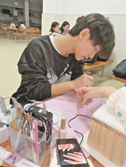 第一次做美甲,是在教学楼的空教室里,给一个寝室的四个女生做的本甲。“第一次做得不是很好,因为技术还不熟练,也不怎么会涂色,甲油胶涂得也不匀。”于子智回忆当时的情形,笑着对记者说,“后来我就趁着暑假,找了一家美甲店练习。除了帮人家干活,其他时间就自己练习做美甲。其实教的东西不多,主要靠自己练,我每天会找自己的朋友过来,免费给他们做美甲,练习技术。”