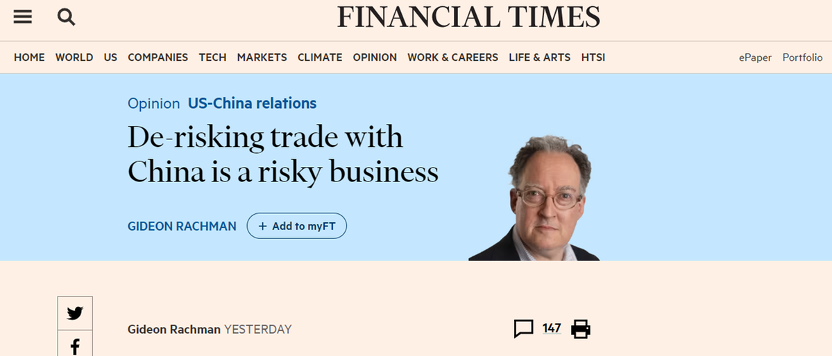 文章说,近期,欧美政要大谈对华关系“去风险”。似乎2023年度词汇的角逐已经结束,地缘政治范畴的年度热词就是“去风险”(De-risking)。