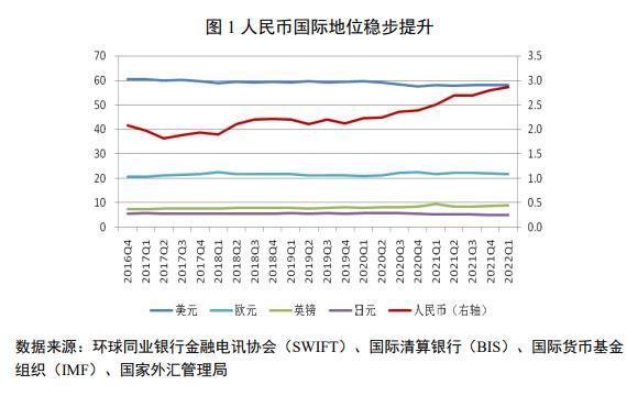 央行最新发布的数据显示,目前,人民币在本外币跨境收付总额中的占比接近50%,2022年,跨境人民币收付总额达42万亿元,比2017年增长3.4倍,已成为全球第五大支付货币。到2022年底,境外主体持有境内人民币资产的余额为9.6万亿元,较2017年增长1.2倍,已成为全球第五大交易货币。目前有80多个境外央行或货币当局将人民币纳入外汇储备,人民币成为全球第五大储备货币,在国际货币基金组织特别提款权货币篮子中的权重排名第三。