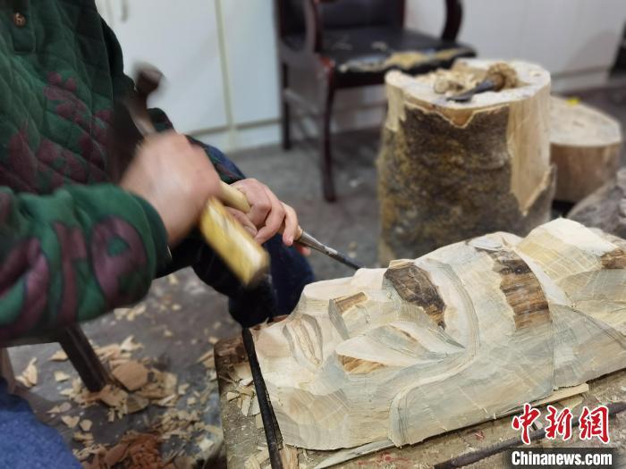 图为杨云霞在雕刻傩面具。 周燕玲 摄
