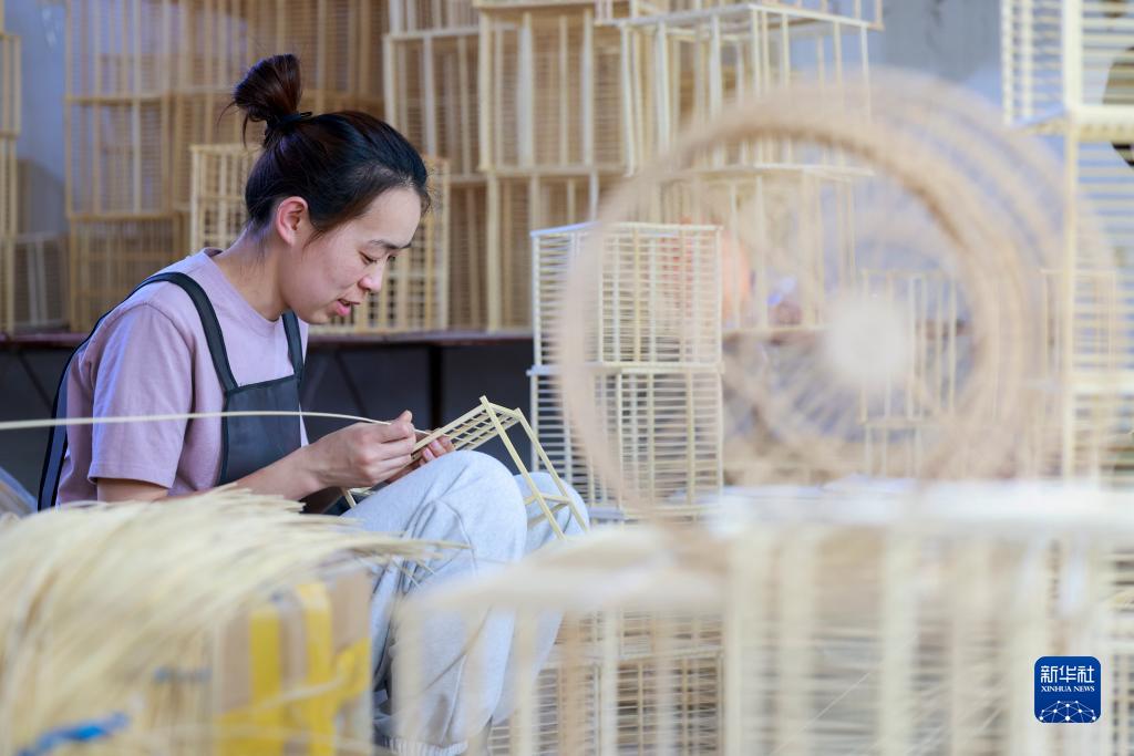 5月30日,在河北省唐山市丰南区黄各庄镇一家鸟笼加工企业,工人在制作鸟笼。