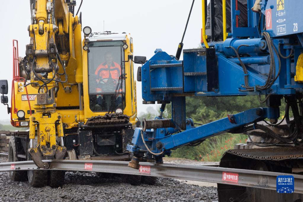 5月30日,在匈塞铁路匈牙利段孔圣米克洛什-陶什站施工现场,工作人员操作机械铺设钢轨。