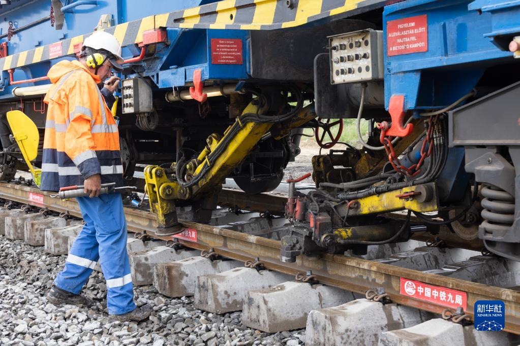 5月30日,在匈塞铁路匈牙利段孔圣米克洛什-陶什站施工现场,工作人员启动铺轨前检修铺轨机组。