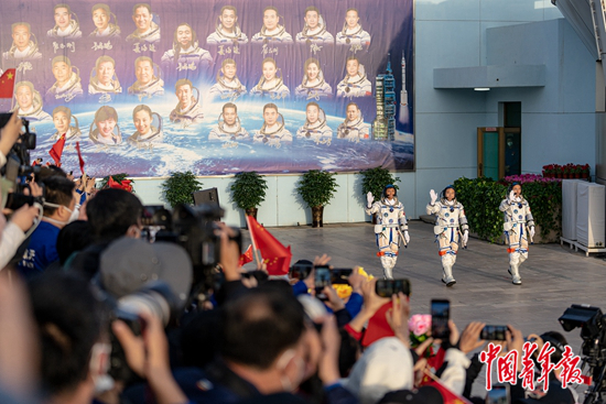 6时42分,身着飞天服的景海鹏、朱杨柱和桂海潮迈着稳健的步伐依次从问天阁会见厅南门走出,欢送人员的鼓掌声、欢呼声霎时间升腾。