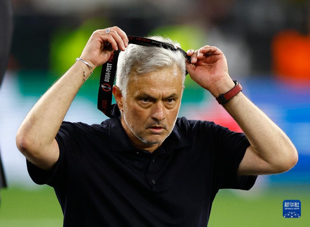 5月31日,罗马队主教练穆里尼奥在颁奖仪式后取下奖牌。新华社/路透