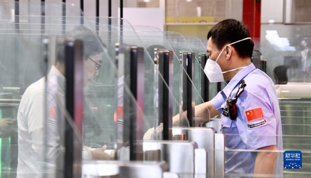 6月1日,北京边检总站的民警在首都国际机场边防检查站为出境旅客提供咨询。