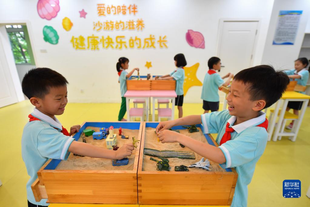 5月31日,在长沙市岳麓区实验小学“心语花溪”心理成长中心的沙盘游戏室,学生在玩沙盘游戏。