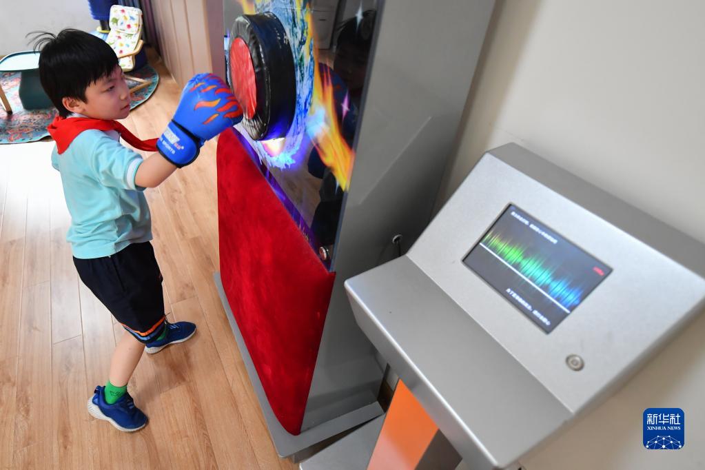5月31日,在长沙市岳麓区实验小学“心语花溪”心理成长中心的情绪宣泄室,学生通过打拳击放松心情。