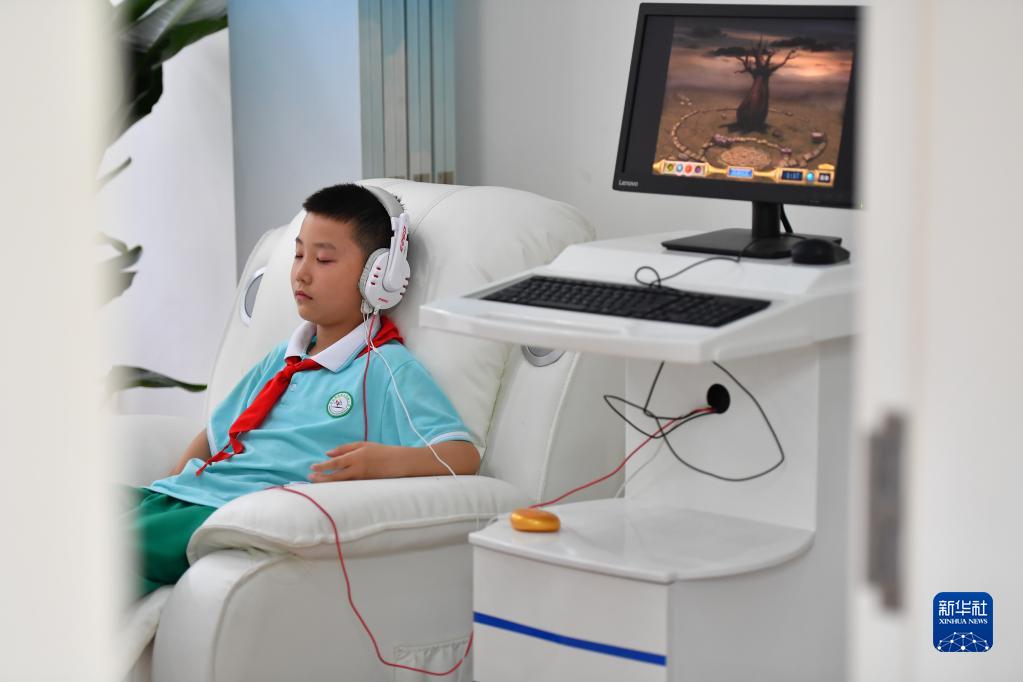 5月31日,在长沙市岳麓区实验小学“心语花溪”心理成长中心的音乐放松室,学生在听音乐放松身心。