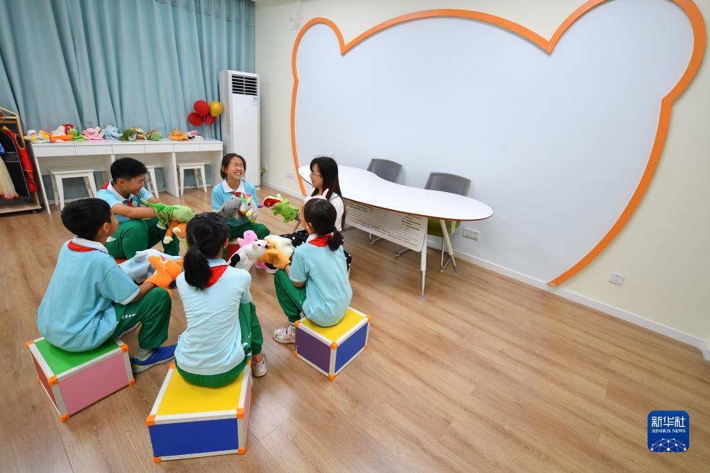 5月31日,在长沙市岳麓区实验小学“心语花溪”心理成长中心,学生在心理健康辅导老师的带领下通过心理剧场的方式表达内心的想法。