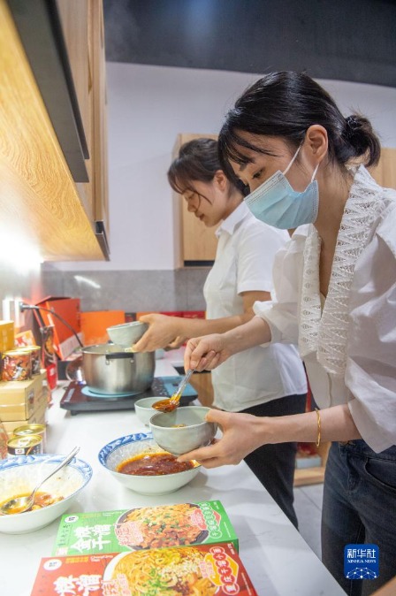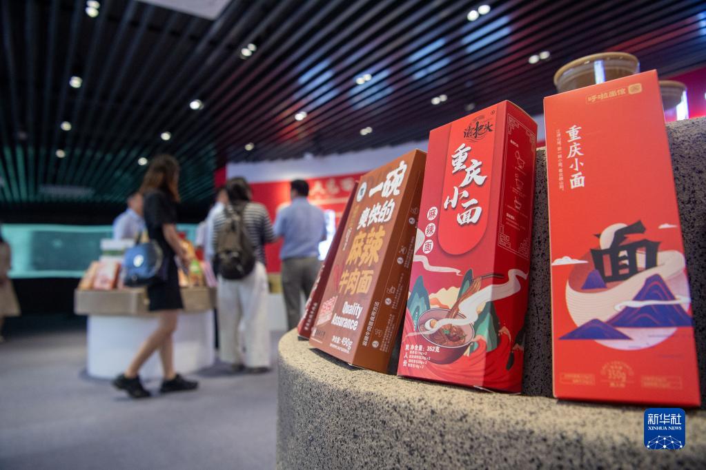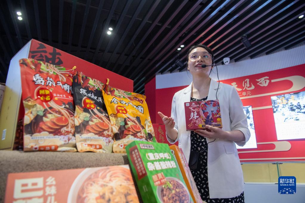 5月30日,在位于重庆市大渡口区的重庆小面产业园,游客在展厅参观选购小面产品。新华社记者 唐奕 摄