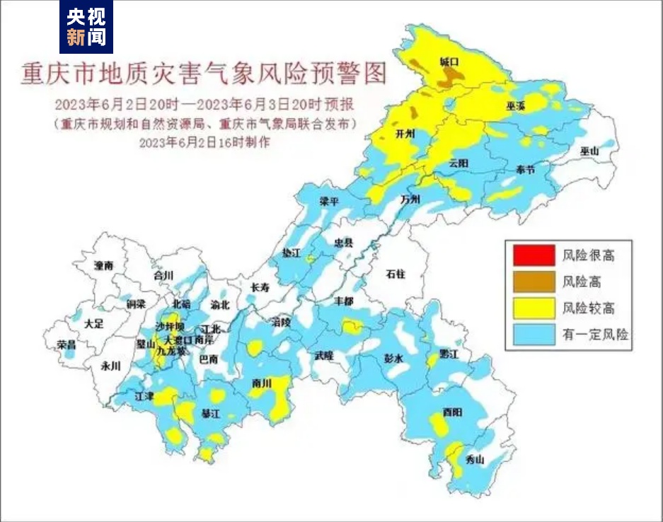 6月2日,重庆市规划和自然资源局与重庆市气象局联合发布全市地质灾害气象风险预警,6月2日20时至6月3日20时,重庆市城口县、开州区属于风险高地区,地质灾害气象风险等级为Ⅱ级(橙色预警)。