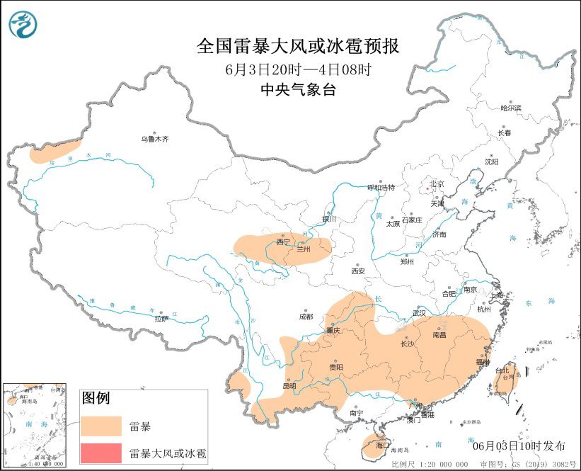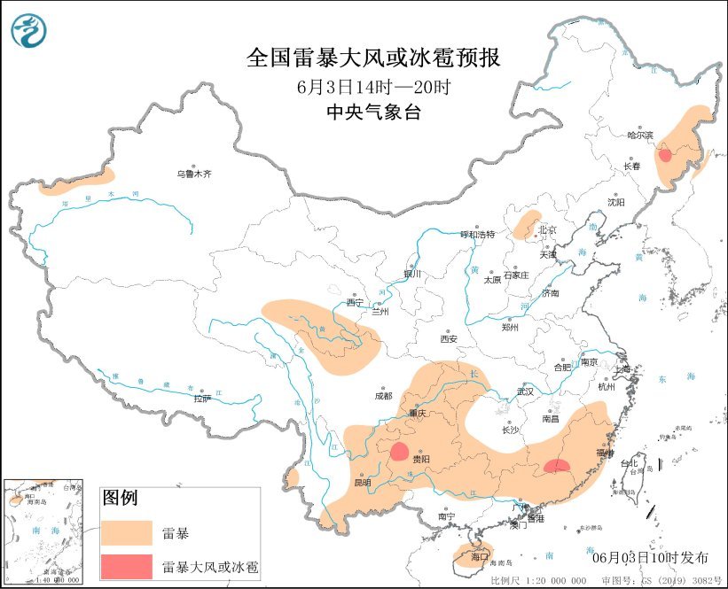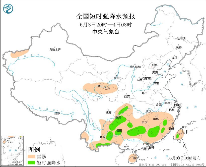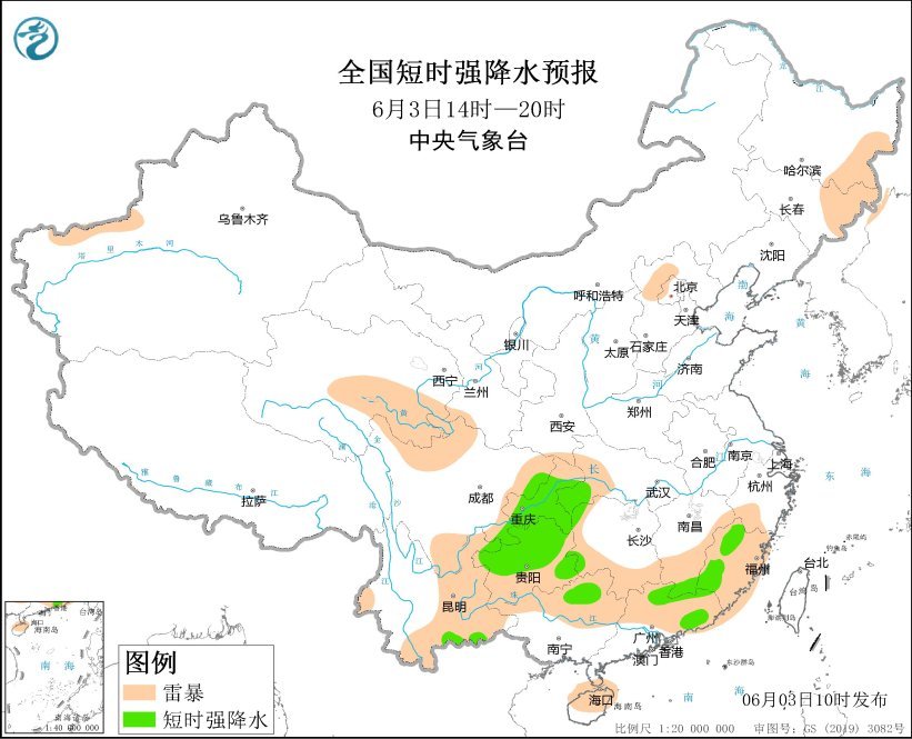 预计6月3日14时至4日08时,重庆中南部、贵州、云南南部、江西南部、广西北部、广东东部、福建西部和南部、台湾岛东部等地的部分地区将有短时强降水天气,小时雨量20-50毫米,局地可达60毫米以上;另外,江西东南部、福建西南部、贵州西部、吉林东部等地的局地将有雷暴大风或冰雹天气。