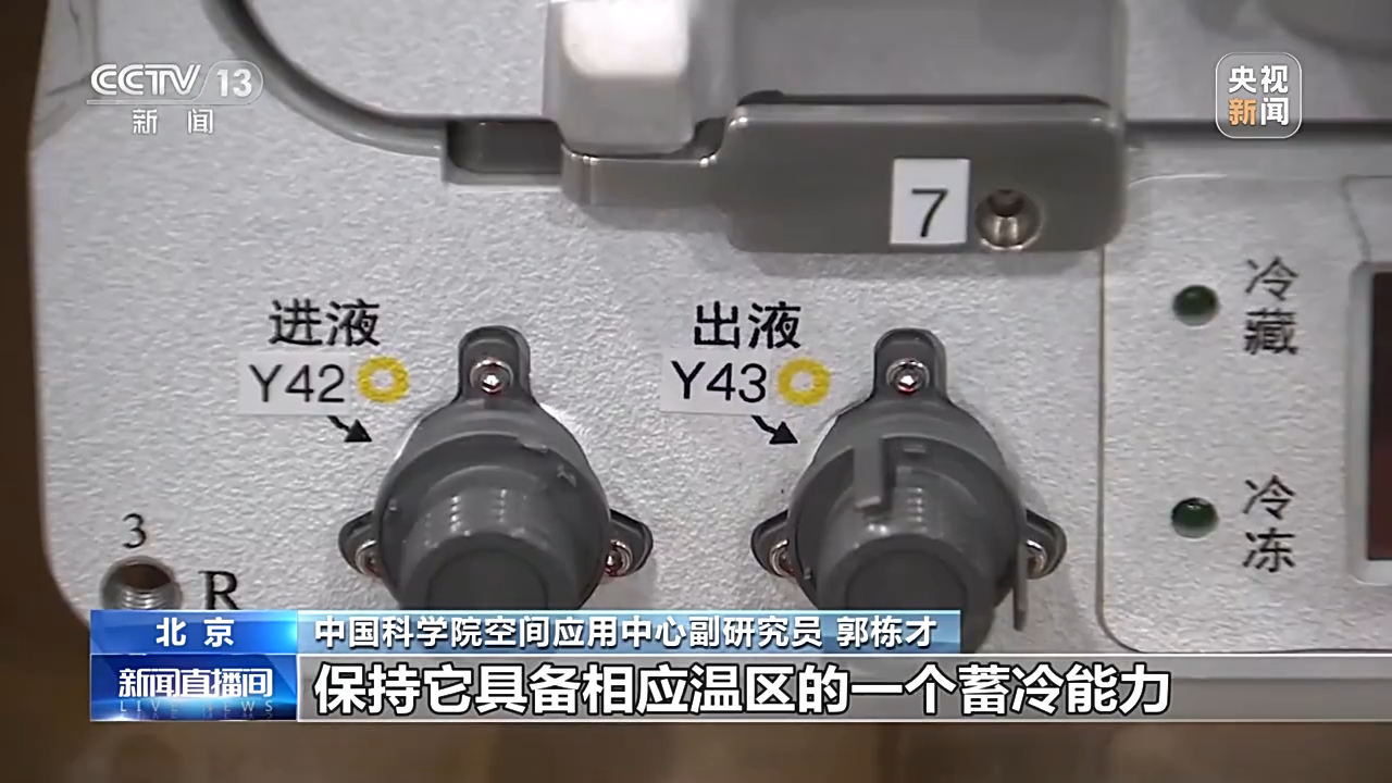 中国科学院空间应用中心副研究员 郭栋才:这台大的预冷装置,顾名思义就是把我们需要下行的冷包中的一些相变材料,进行提前在轨预冷,保持它具备相应温区的一个蓄冷能力,保证样品在整个下行回收期间的存活。目前,我们能存储24到30多个小时;整个温度变化可以控制在正负大概就是5℃—6℃的样子。