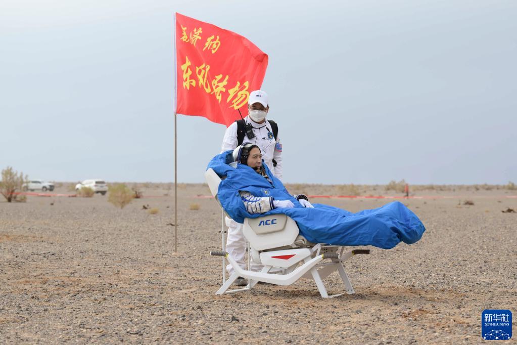 6月4日,神舟十五号载人飞船返回舱在东风着陆场成功着陆。这是航天员张陆安全顺利出舱。新华社记者 李志鹏 摄