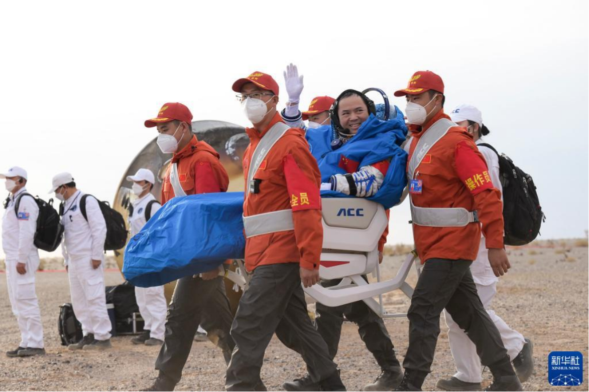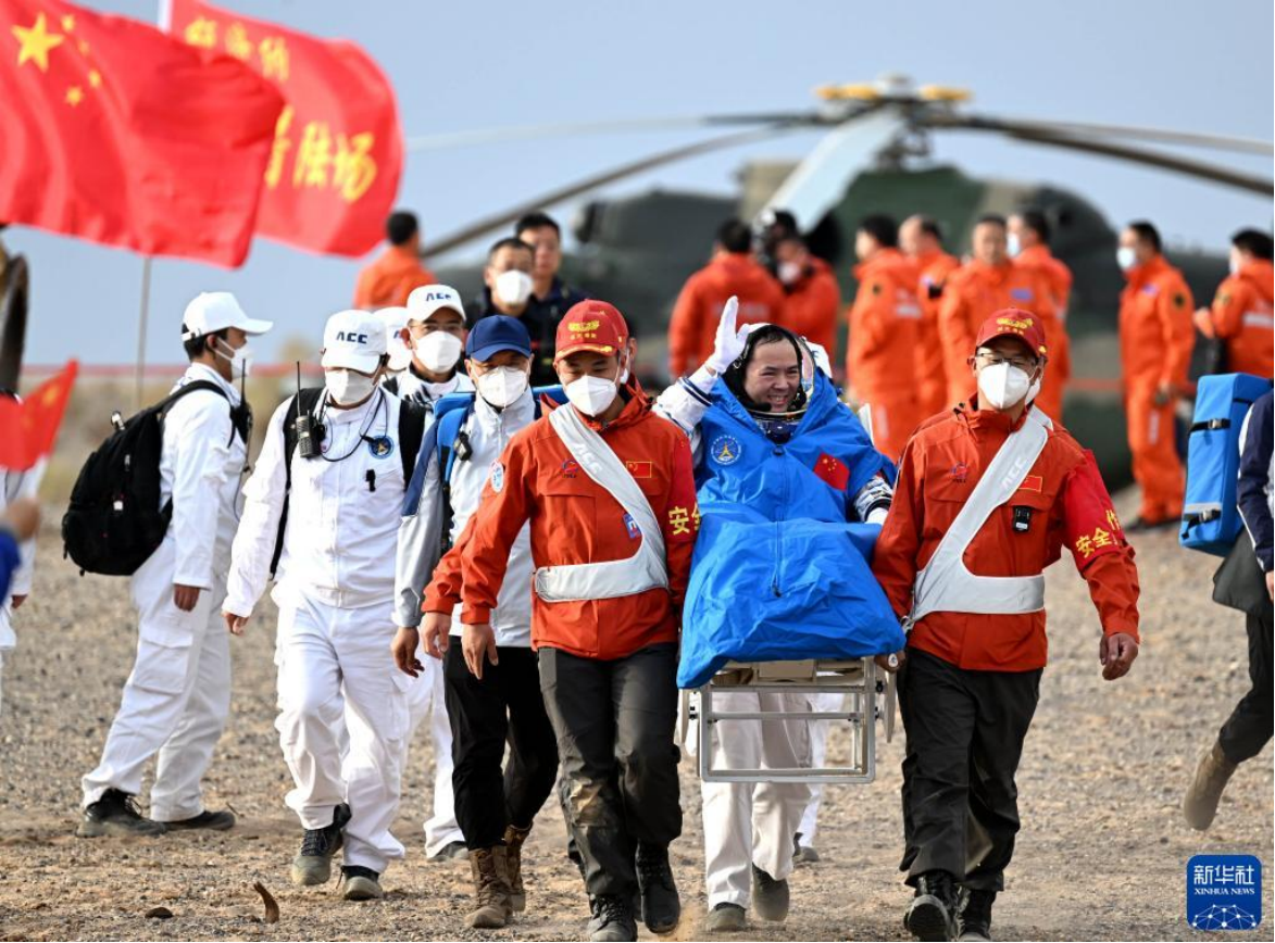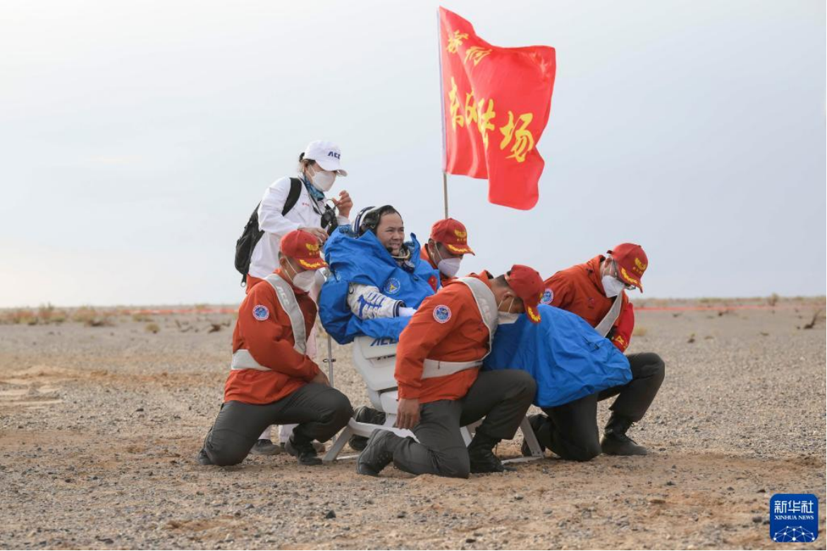 6月4日,神舟十五号载人飞船返回舱在东风着陆场成功着陆,神舟十五号载人飞行任务取得圆满成功。这是航天员张陆安全顺利出舱。新华社记者 连振 摄