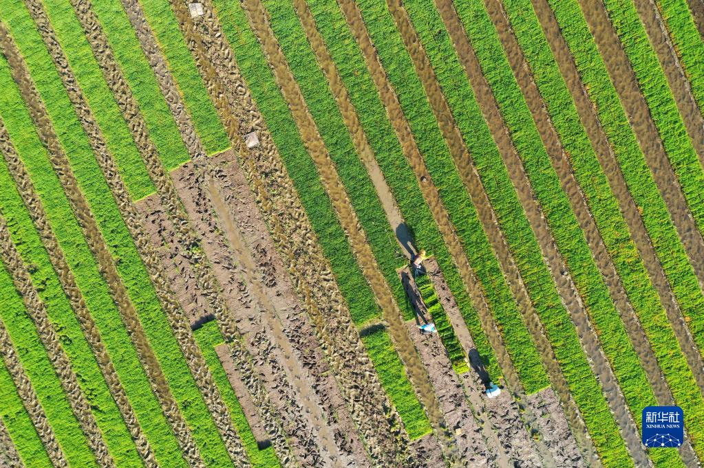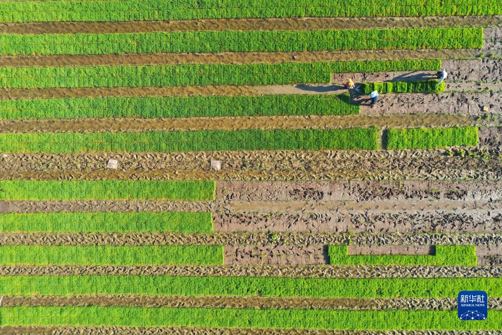 6月2日,山东省青岛市即墨区蓝村街道清香水稻种植合作社的农民在搬运秧苗(无人机照片)。新华社发(梁孝鹏 摄)