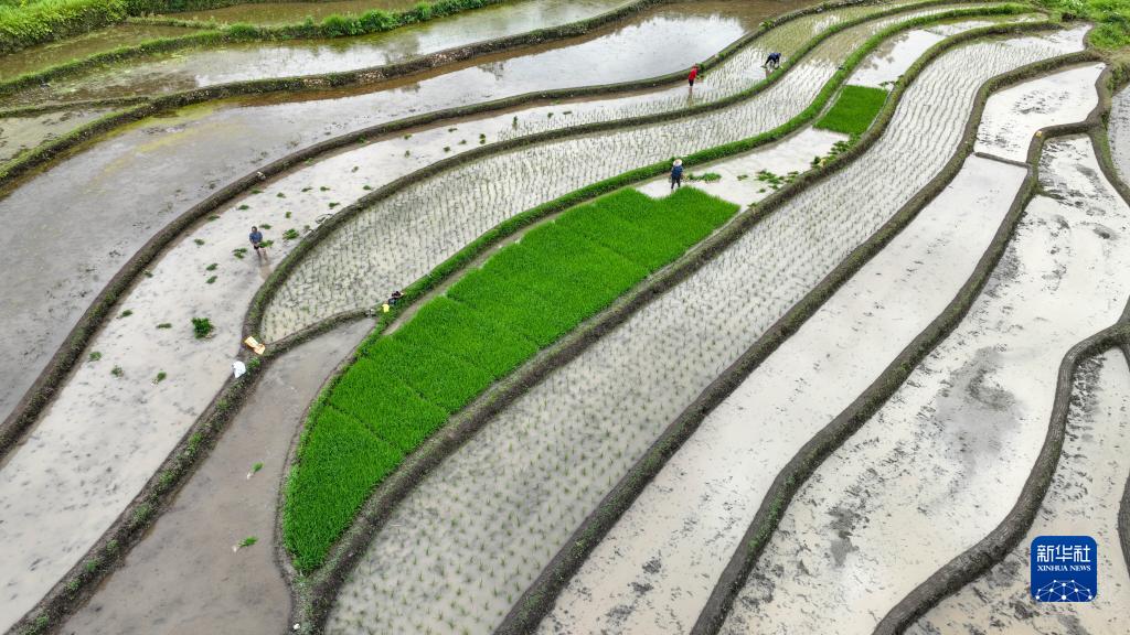 6月3日,村民在贵州省开阳县禾丰乡马头村水稻田间管护秧苗(无人机照片)。新华社发(袁福洪 摄)