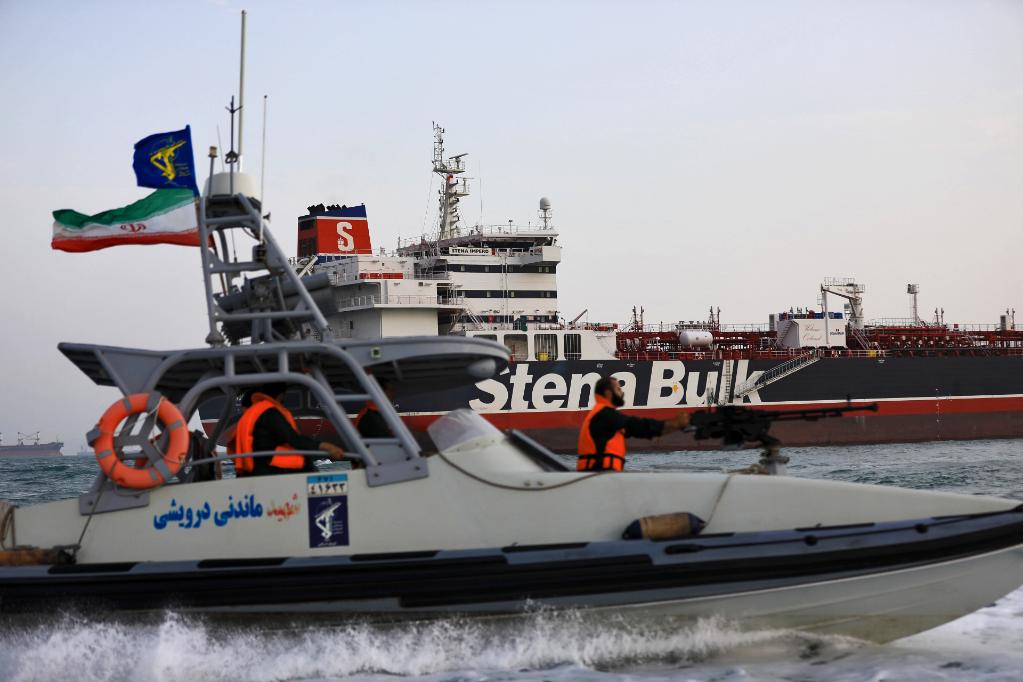 2019年7月21日,在伊朗霍尔木兹海峡附近,伊朗伊斯兰革命卫队的船只在“史丹纳帝国”号油轮周围巡逻。伊朗官员21日说,伊方所扣押一艘英国籍油轮“史丹纳帝国”号上的船员安全,伊方将依据规定调查这艘油轮。新华社/伊朗学生通讯社