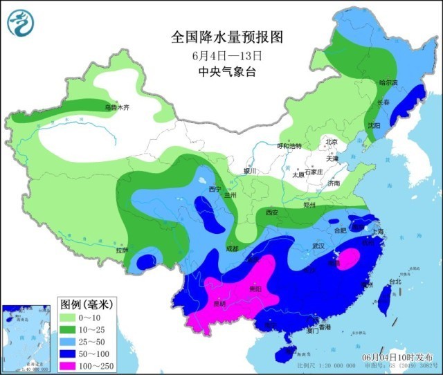 未来10天(6月4-13日),四川盆地东部和南部、贵州、云南、江南、华南及湖北西部等地累计降水量有40~70毫米,其中重庆南部、贵州、云南东部和南部、广西西北部、江西东北部、浙江西南部、福建西北部等地的部分地区有90~150毫米,局地200毫米以上;黑龙江北部和南部、吉林东部、青海东南部等地累计降水量有30~60毫米。与常年同期相比,江南大部、华南中东部、华北、黄淮及西北地区东部等地累计降水量偏少。