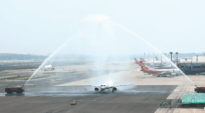 5月28日12时31分,经过1小时59分钟飞行,由C919大型客机执飞的东方航空MU9191航班平稳降落在北京首都国际机场,穿过象征民航最高礼仪的“水门”。 魏萌摄(新华社发)