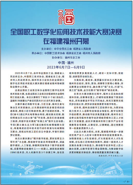 2023年6月7日,由中华全国总工会、福建省人民政府主办,中国职工技术协会、福建省总工会、福州市人民政府承办,福州市总工会协办的全国职工数字化应用技术技能大赛决赛在福建省福州海峡国际会展中心开幕。