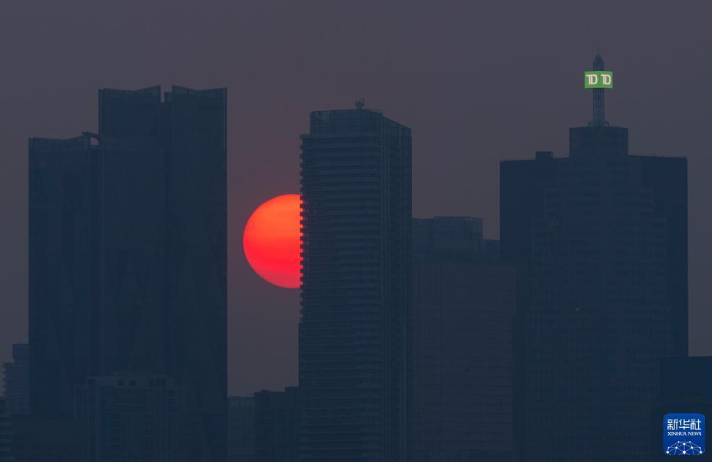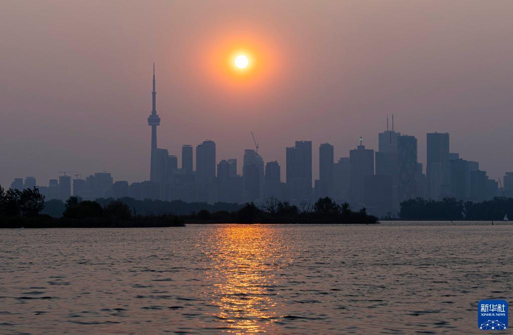 这是6月6日在加拿大多伦多拍摄的笼罩在烟尘中的落日。