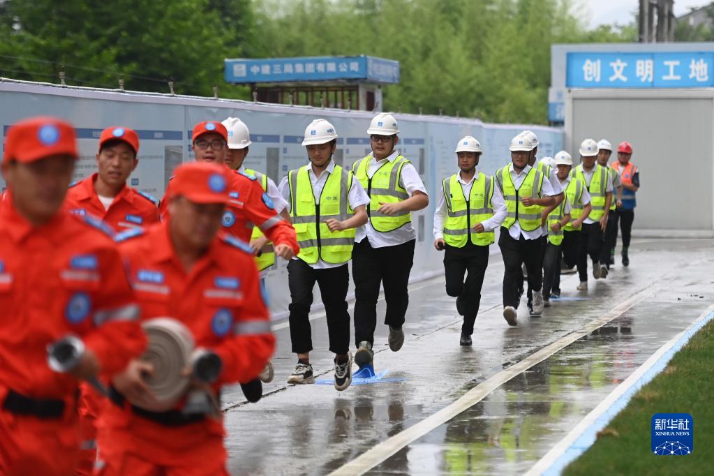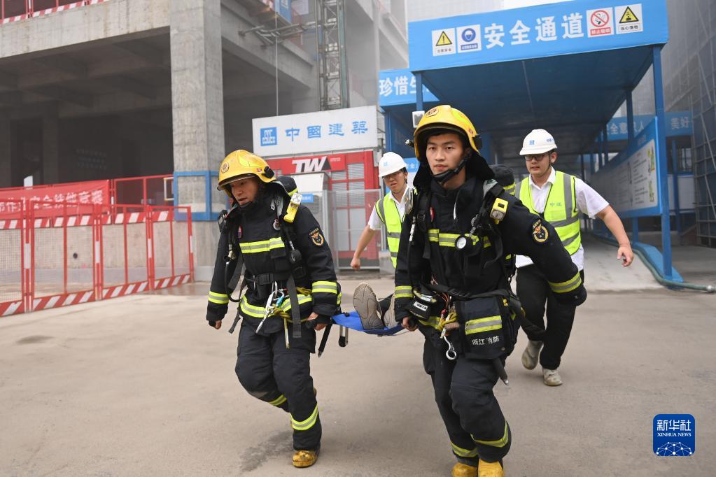 6月6日,浙江省杭州市富阳区“安全生产月”消防应急演练在中建三局富阳银湖生物信息产业园项目工地启动,现场进行火灾扑救、人员施救等环节的演练,以提升安全生产应急能力。