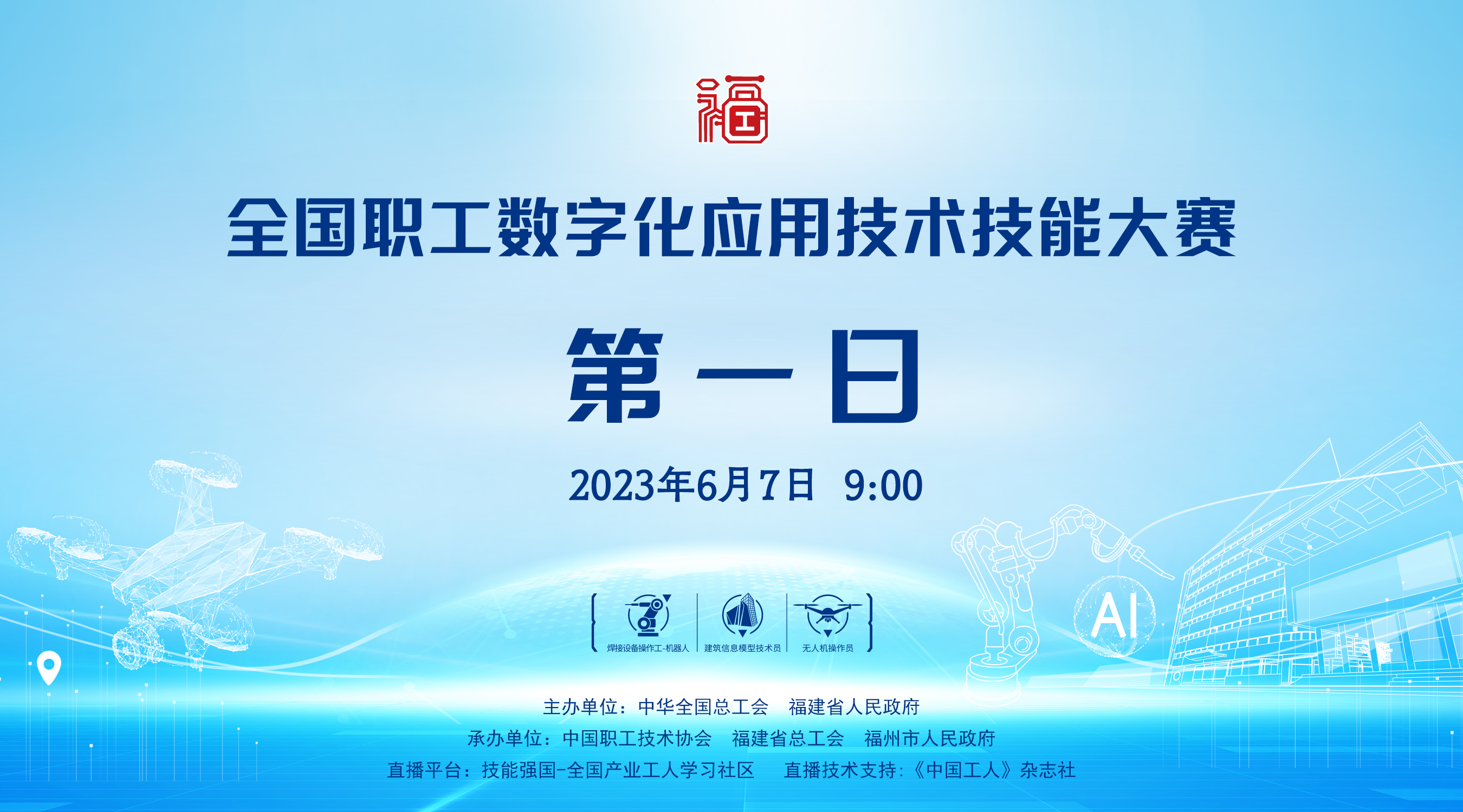 全国职工数字化应用技术技能大赛第一日 今天(6月7日),全国职工数字化应用技术技能大赛决赛在福建福州海峡国际会展中心举办。本届大赛设置焊接设备操作工—机器人、建筑信息模型(BIM)技术员、无人机操作员等3个决赛工种。中工网首页、微博、视频号同步直播。一起直击大赛现场!