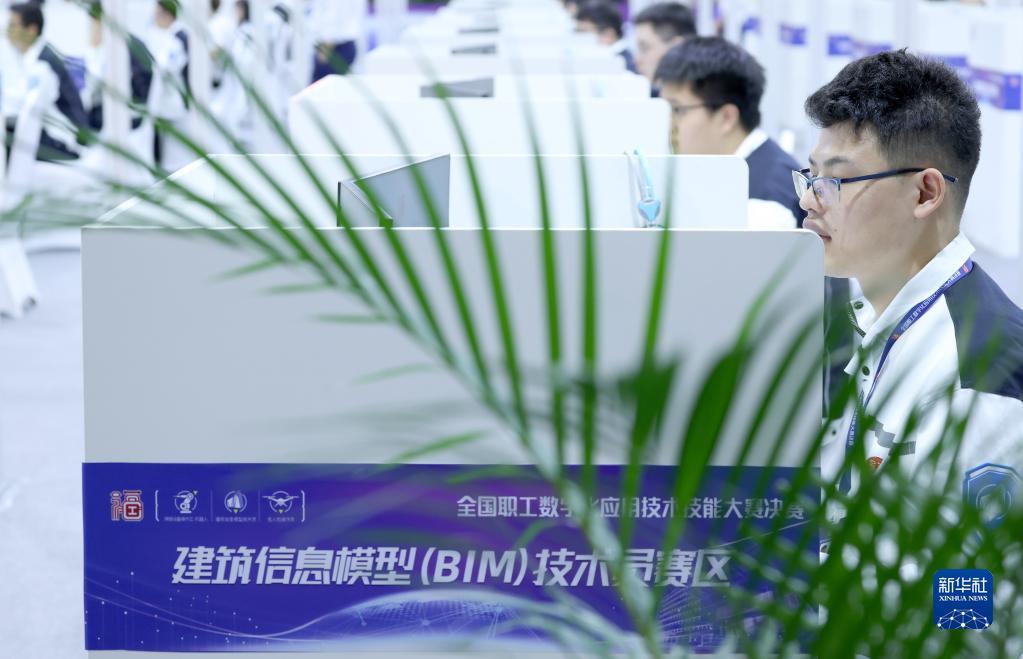 6月7日,参赛选手在建筑信息模型(BIM)技术员项目的比赛中。