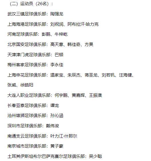 最新一期国足亚运队集训名单。图片来源:中国足协网站