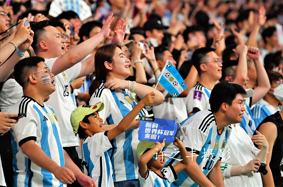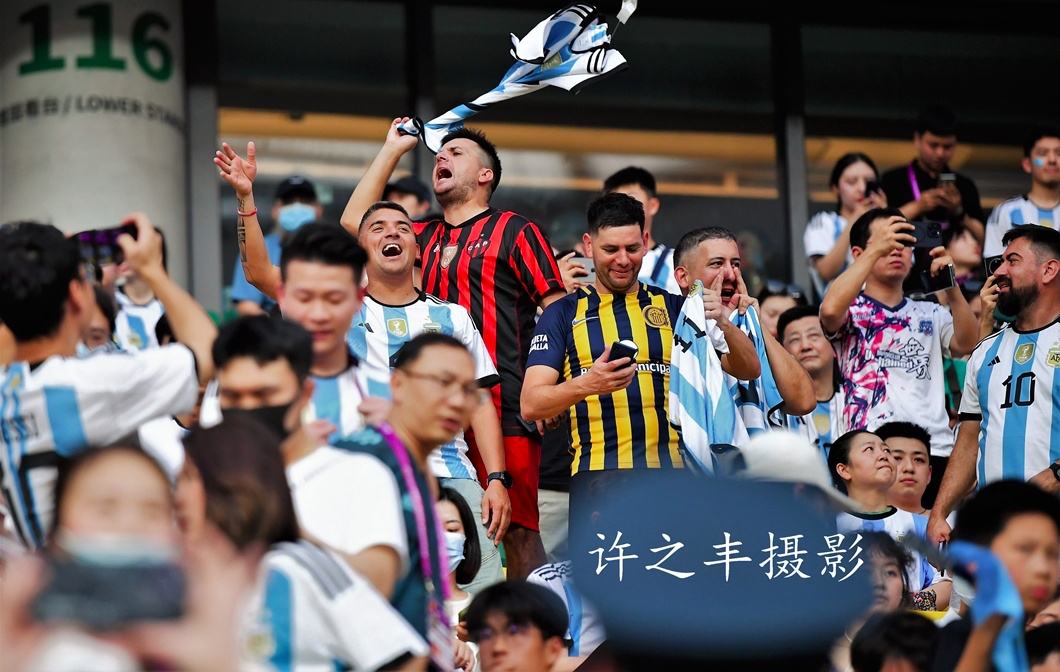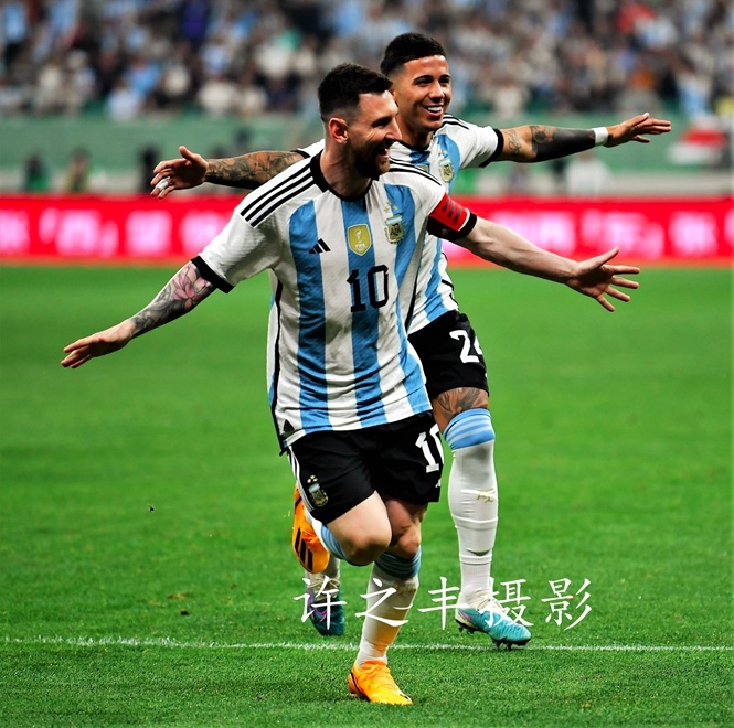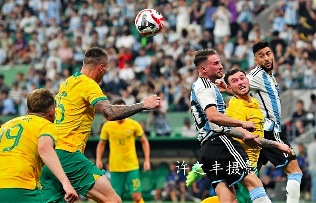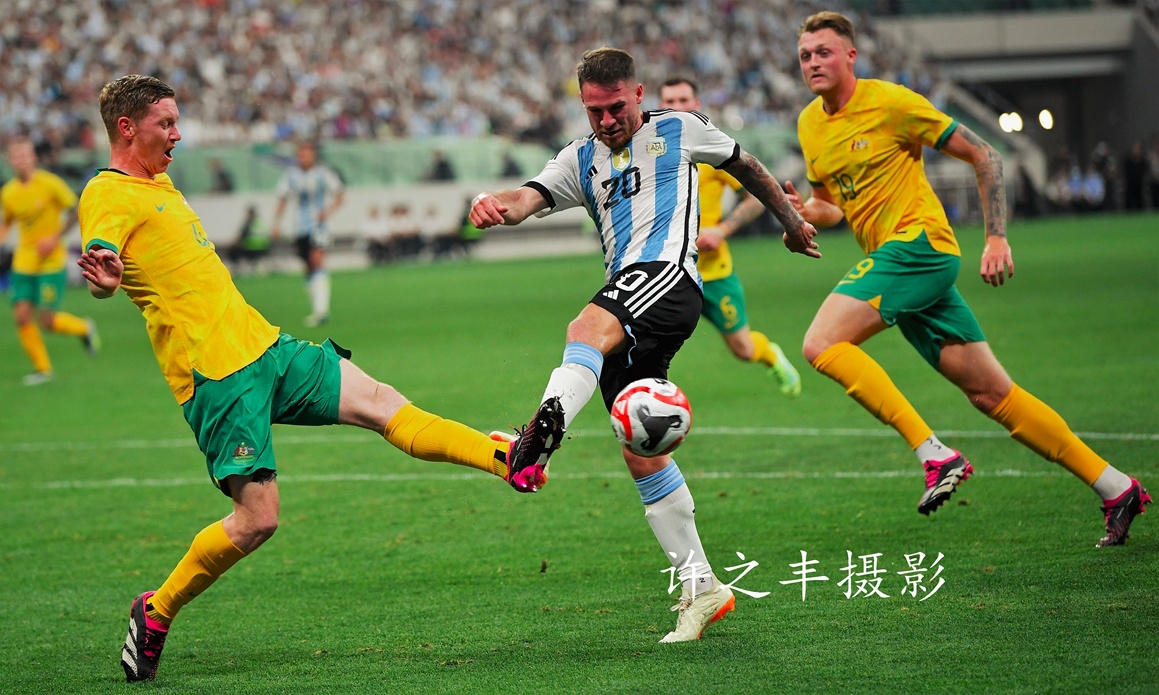 6月15日晚,在北京工人体育场,梅西在阿根廷男足国家队与澳大利亚男足国家队的国际足球邀请赛中。本场比赛,阿根廷队最终2比0战胜澳大利亚队。开场仅81秒,阿根廷球员梅西就攻入一球,这是他个人生涯最快进球。5.1万名球迷现场见证了梅西踢满整场比赛。图为双方比赛瞬间。(许之丰 摄)