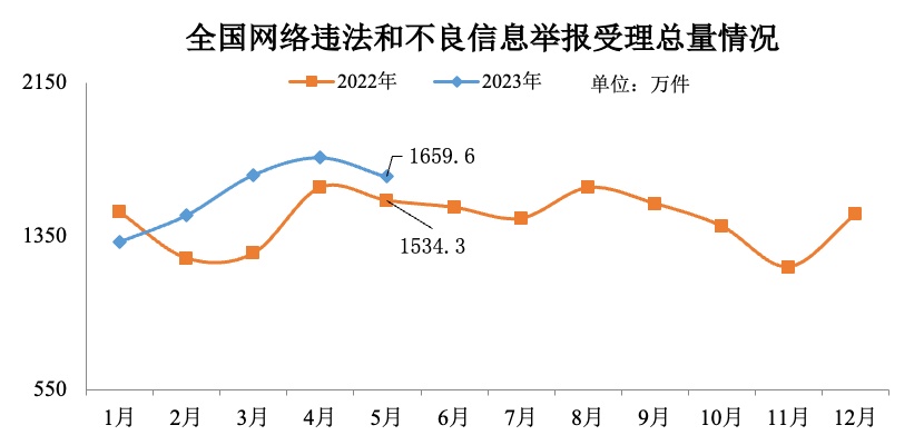 中央网信办举报中心近日公布的统计数据显示,2023年5月,中央网信办举报中心指导全国各级网信举报工作部门、主要网站平台受理网民举报色情、赌博、侵权、谣言等违法和不良信息1659.6万件,环比下降5.8%、同比增长8.2%。