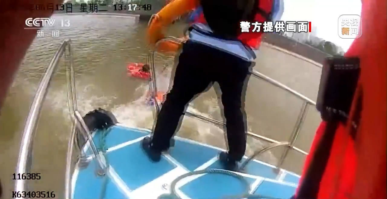 杭州市公安局交通治安分局钱江水上派出所民警 刘朝玉:我们是(6月)13日下午,13时08分接到群众报警,快艇距离女子五米左右,我就从快艇跳下去了,从男的(彭清林)手里接过来,就慢慢往快艇上带。