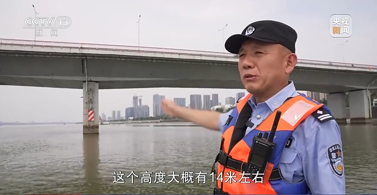 杭州市公安局交通治安分局钱江水上派出所民警 刘朝玉:这个高度大概有14米左右,相当于五层楼(高)不到,这样的高度跳下来,速度相当于汽车的50到60码,到水面有缓冲,落水一瞬间可能会落入水下2到3米左右,小伙子勇气是可嘉的。通常情况下,第一时间报警求助,(再)寻找一些可以救援的装备或物资,(救生圈)泡沫板扔下来,为后续救援赢得时间。