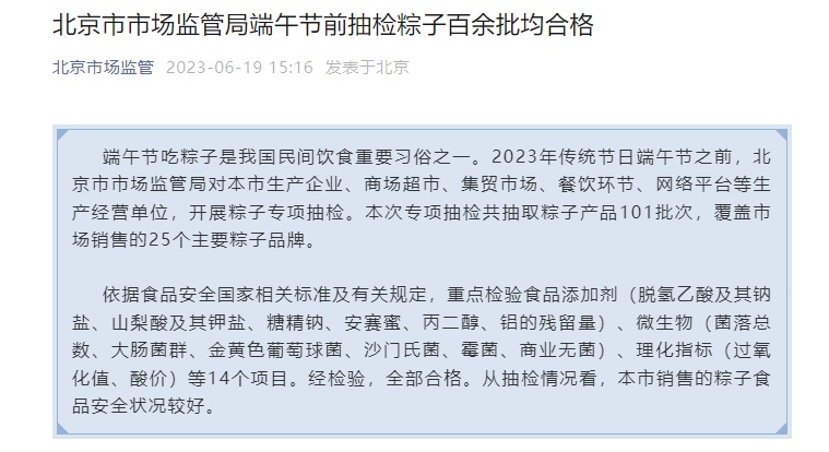 北京市市场监管局:端午节前抽检粽子百余批均合格