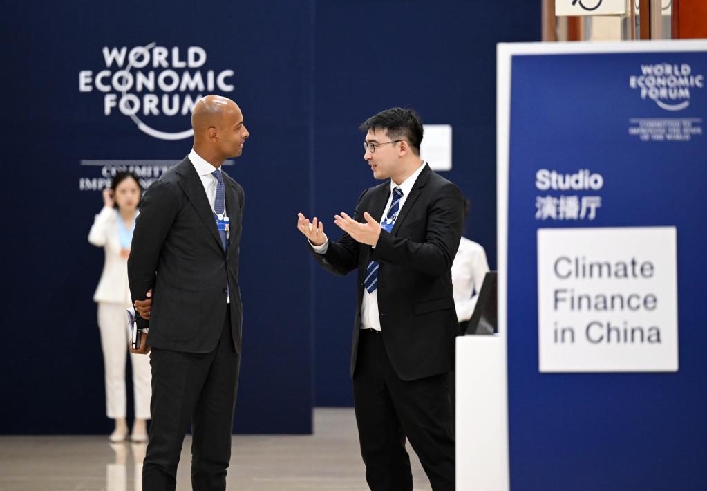 6月28日,夏季达沃斯论坛,与会者在论坛会场交流。新华社记者赵子硕 摄