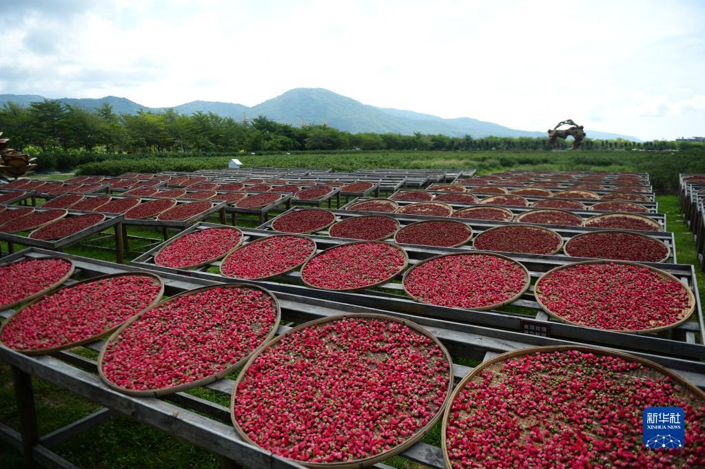 这是6月29日在位于博后村的亚龙湾国际玫瑰谷拍摄的食用玫瑰。玫瑰谷所在地曾是一片盐碱地,现已发展成为集玫瑰种植培育、玫瑰产品研发销售、观光旅游等为一体的玫瑰产业基地。