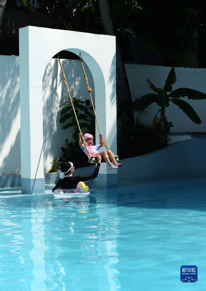 6月28日,游客在博后村一家民宿的泳池内玩耍。