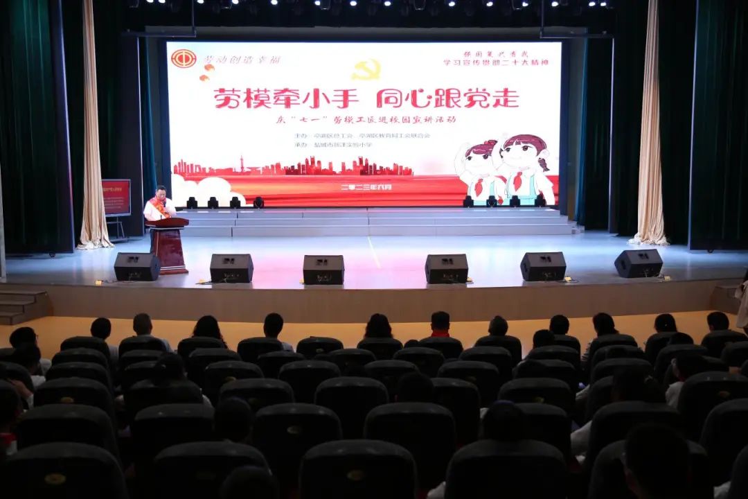 中工网讯 6月26日,江苏省盐城市新洋实验小学新梦剧场里座无虚席,由亭湖区总工会、亭湖区教育局工会联合会主办,盐城市新洋实验小学承办的“劳模牵小手 同心跟党走”庆“七一”劳模工匠进校园宣讲活动在这里举行。