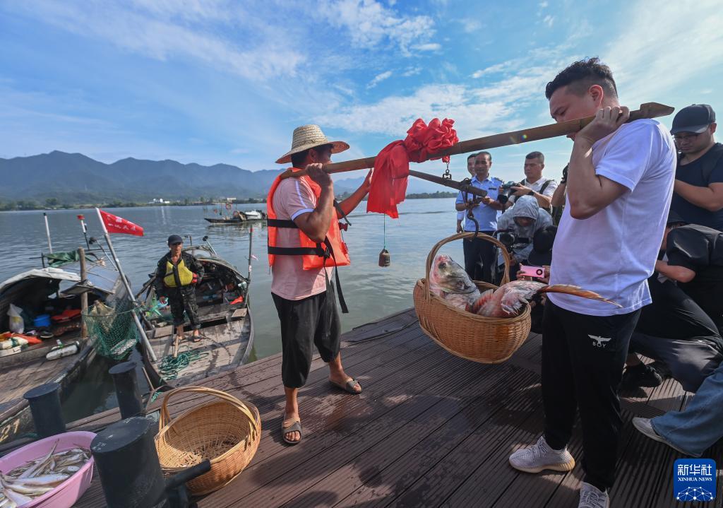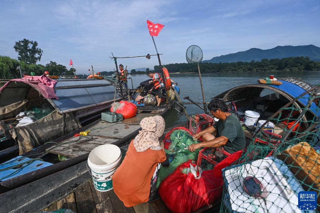 7月3日,富春江开渔节在浙江省杭州市富阳区场口镇东梓关村的码头举行,当地渔民满载着鱼获,返回东梓关码头,喜迎开渔后首场丰收。为有效保护鱼类产卵、孵苗及幼鱼生长,促进鱼类资源的自然补充和水域生态环境的自我修复,浙江钱塘江流域每年3月1日至6月30日实施禁渔,范围包括钱塘江、富春江、衢江、兰江、千岛湖等钱塘江干流。