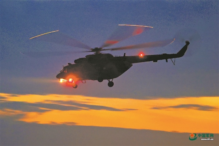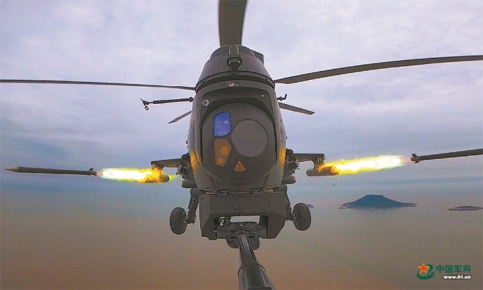 塔台下达起飞指令后,数架武装直升机接续升空,快速完成战斗编组。飞行途中,战机根据战场情况不断变换战斗队形,时而低空掠海飞行,时而借助地形隐蔽突防。