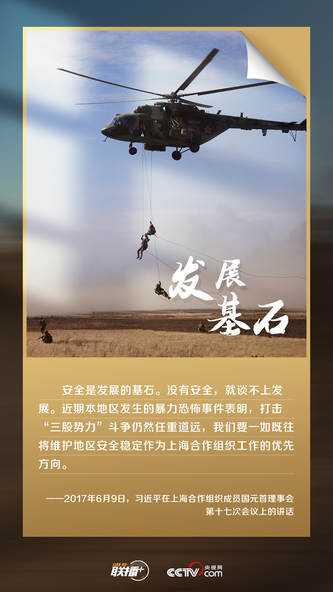 没有安全作为基石,发展就是空中楼阁,无从谈起。2017年,习近平主席主张上合组织要“构建平等相待、守望相助、休戚与共、安危共担的命运共同体”。2019年,他提议把上合组织打造成“团结互信、安危共担、互利共赢、包容互鉴的典范”。针对当今世界变乱交织、百年变局加速演进,在本次讲话中,习主席强调,实现地区长治久安是各方的共同责任。