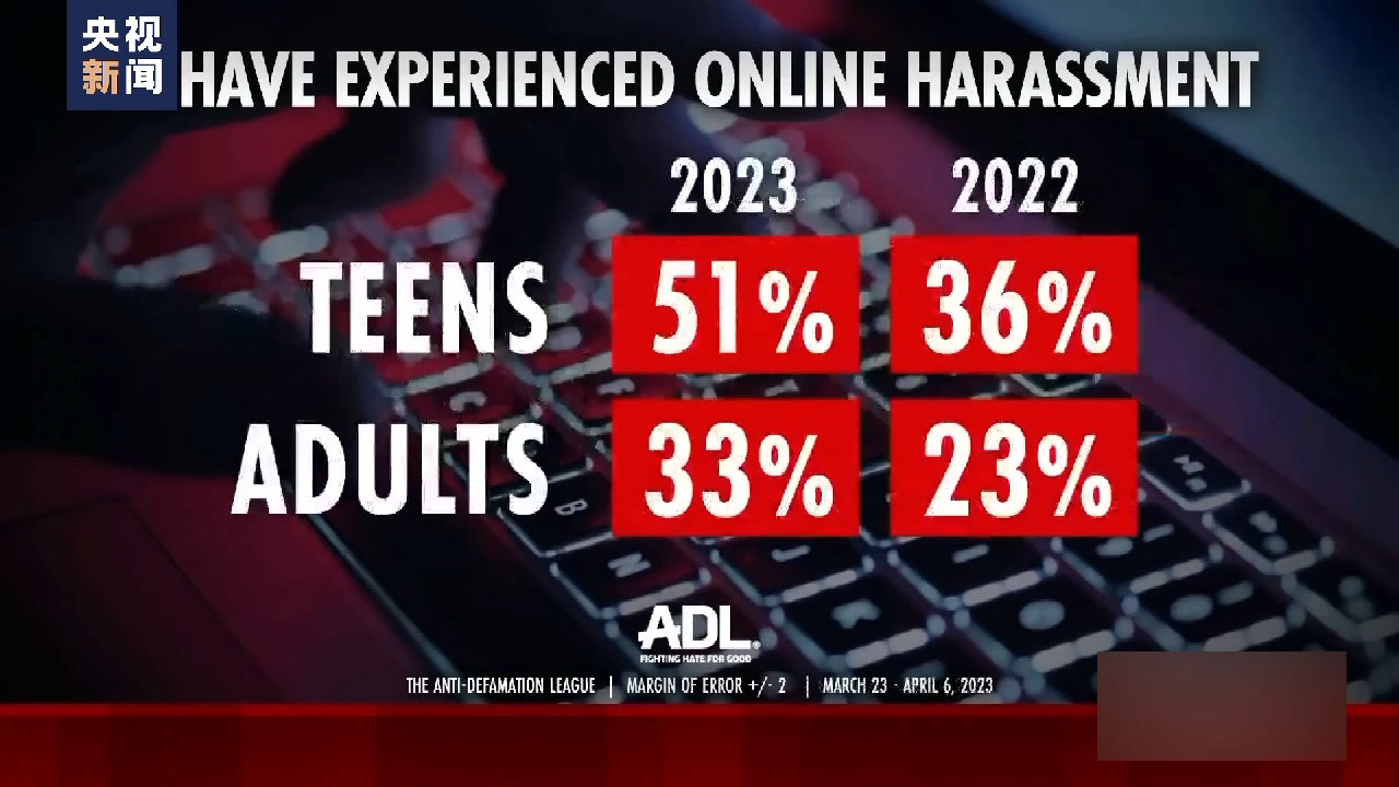 调查报告显示,在受访的美国人中,共有52%,也就是超过一半的人表示,曾在生活中经历过网络仇恨和骚扰,而去年这一比例为40%。报告称,网络仇恨和骚扰事件在青少年群体中增长明显,由去年的36%升至51%,上升了15%。此外,有大约33%的成年人表示曾遭受这类事件,高于去年的23%。