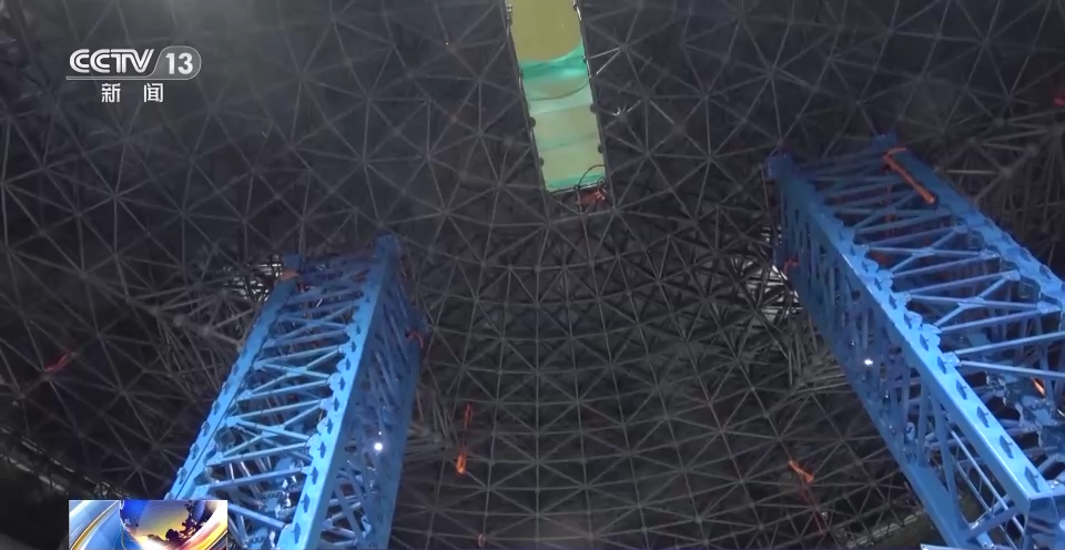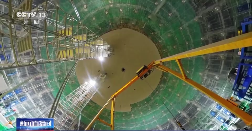 总台央视记者 帅俊全:现在我就来到了江门中微子实验的水池底部,正在建造的就是世界最大也最灵敏的液体闪烁体中微子探测器,在脚手架的这个施工平台上方,此时此刻正在施工的就是世界最大的直径35米的有机玻璃球,现在正在进行它的最大圈层赤道层的安装。